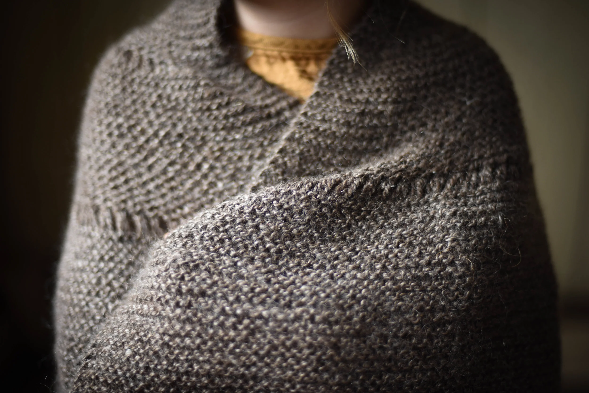 Cora has been begging me for a shawl, and how can I say no to a hand knit item that my children are asking for? I knew I wanted to use my favorite batch of yarn...'Phinela' is our 40% mohair/ 60% Finn sheep blend, in an amazing chocolate color. So very soft, and the luster is out of this world. I've actually considered keeping all the skeins I have left because I love it so.
